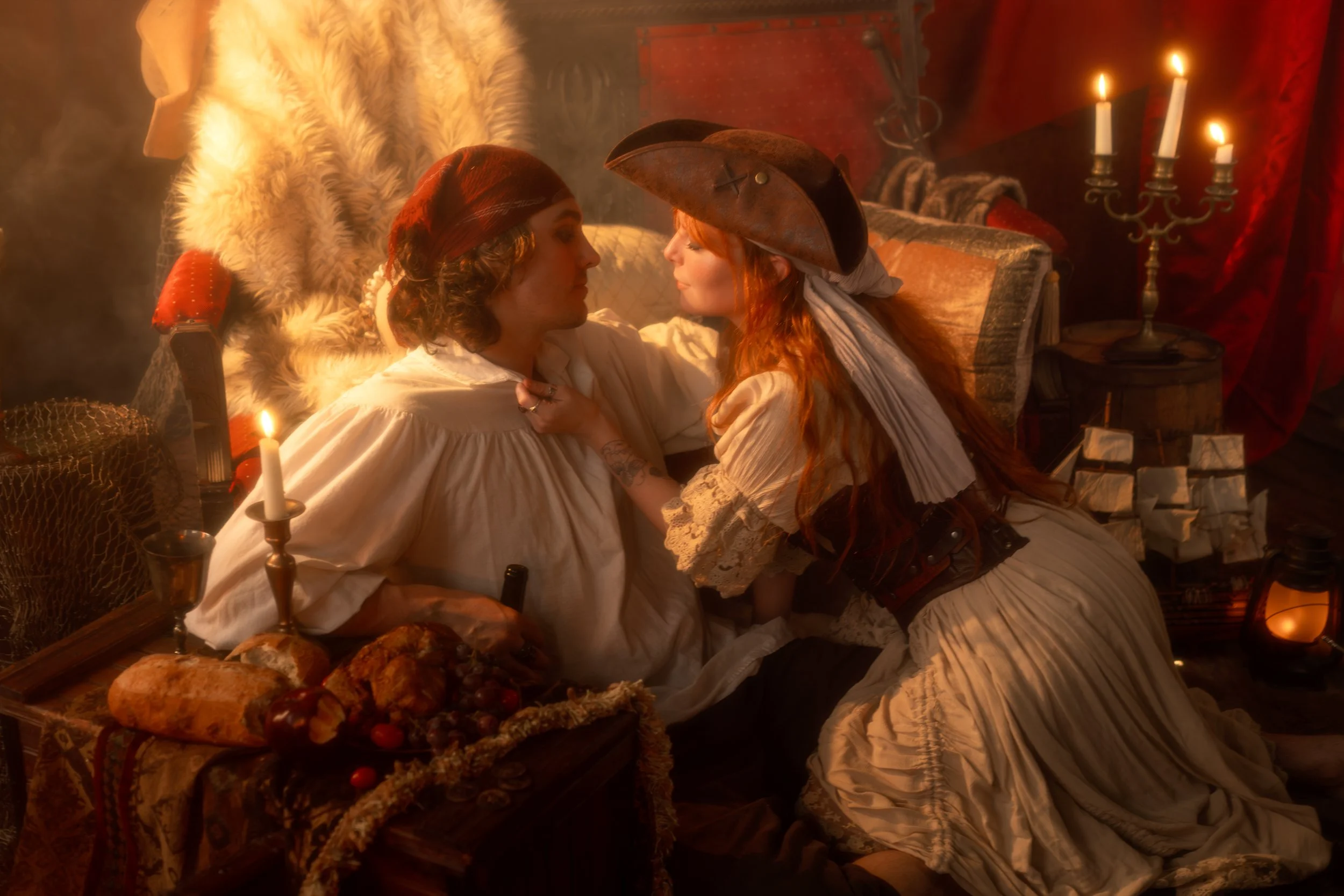 The Captain’s Quarter’s, a pirate couples below-deck concept modeled by Cait (@honeyswordcosplay) and Cody (@caffasaurus)